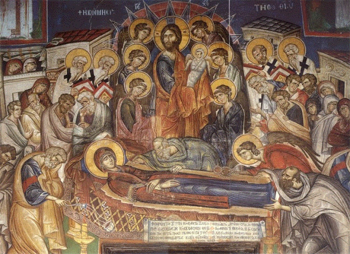 Η Κοίμηση, ουσιαστικά η κηδεία, της Θεοτόκου μετατρέπεται σε πανηγυρική εορτή και οι λυπητεροί ύμνοι γίνονται χαρούμενοι. Φαίνεται παράδοξο με την πρώτη ματιά, αλλά αν εμβαθύνει κανείς θα προσέξει πως πρόκειται για θαυμαστό γεγονός. Ο Υιός της Αειπάρθενου Μαρίας με το θάνατό του νίκησε το θάνατο. Τα δάκρυα της θλίψης και του πένθους μεταβλήθηκαν σε δάκρυα χαράς, αγαλλίασης και ελπίδας.